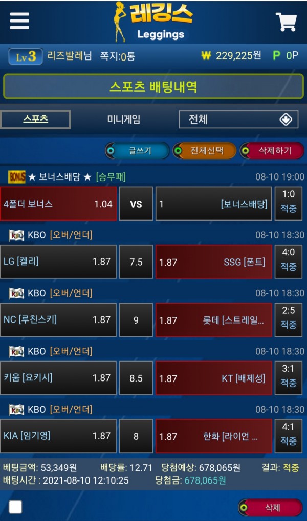 다시재개한 KBO 배팅!! 레깅스에서 행운의 올언더당첨!!!!
