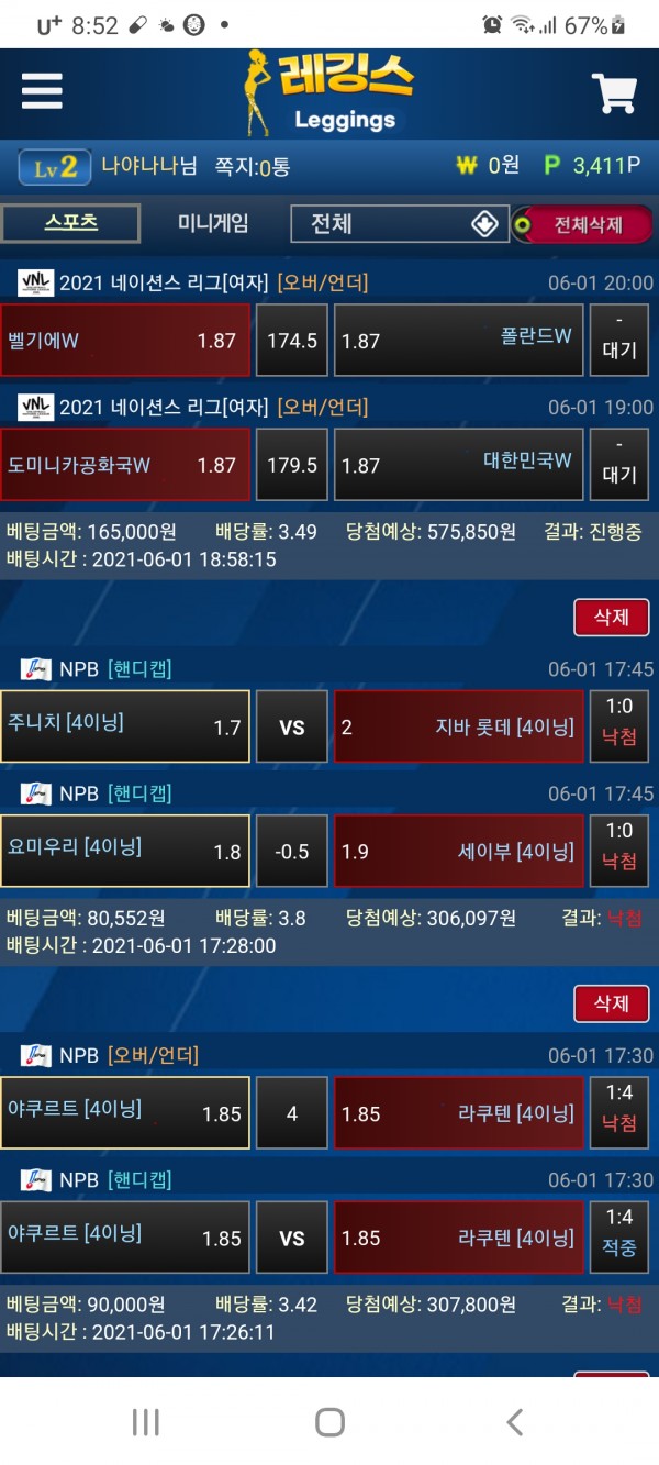 오늘 첫 레깅스 리뉴얼 되고 큰꿈을 안고 배팅했지만