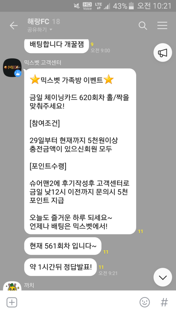 오늘 믹스벳 가족방 이벤트 오랫만에 당첨됐네요