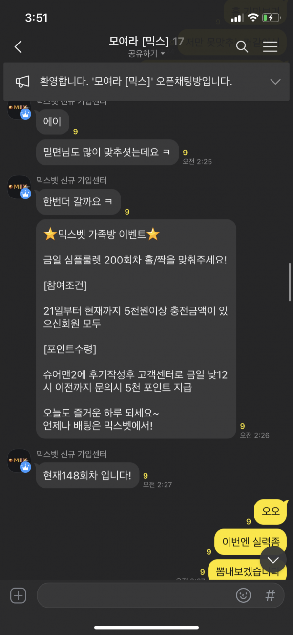 가족방에서 배팅공유도 하고 이벤트도 참여해보셔용!