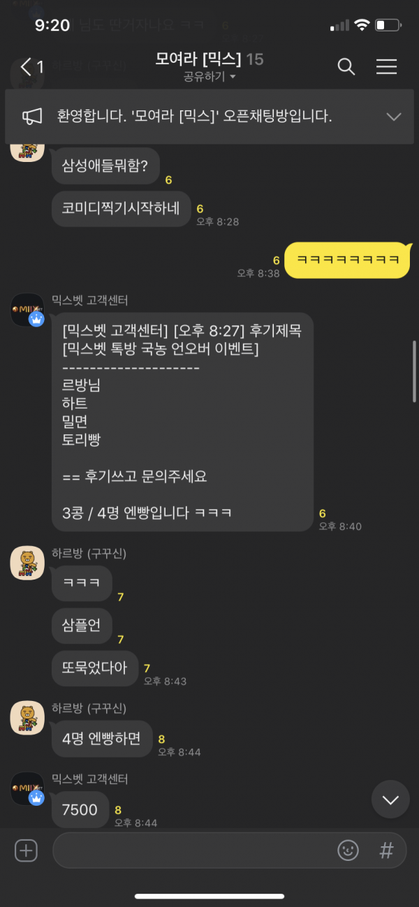 크 오늘 이벤트 한다고 걸어주신 실장님 가족방 회원분