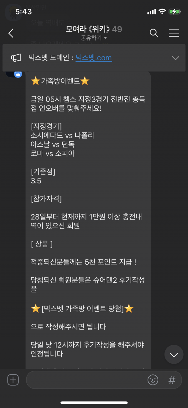 안녕하세요 일꾼마왕입니다 ^^ 오늘도 여지없이 가족방 이벤트 당첨 후기를 남기러 왔습니다~ 우리 배터들에게 참 힘이되지요 이런 소소한 이벤트 너무 좋습니다 ~ 가족방에서 정보도 공유하고 각종 이벤트도 참여하고 ~ 서로서로 윈윈 아닙니까 다들 믹스벳 얼른 놀러오셔서 건승하세요 !