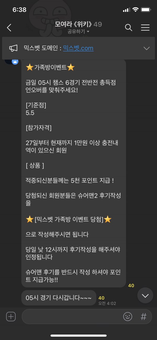 오늘은 5시 챔스 전반 언오버 맞추기 ^^ 매일매일 가족방에서 다양한 이벤트 진행하니 이럴때 꽁머니 타가셔야죠~ 가족방 들어오기만 해도 꽁머니 지급인데 ! 다들 얼른 믹스벳 놀러오세요~~ 건승 !