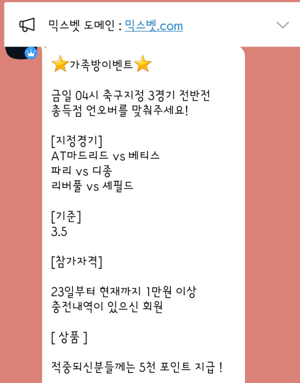 전 파리와 리버풀보고 바로 오바갔습니다 여지없이 오바 적중이네요 파리오버는 신앙입니다 요즘 이벤트적중을 잘못했는데 오늘은 감사하게도 적중이되었네요 믹스벳 가족방오시면 이처럼 이벤트가 진행되고있어요 당첨시 5천 플러스 알파라는 많은 포인트를 주시는데 정말 혜자네요