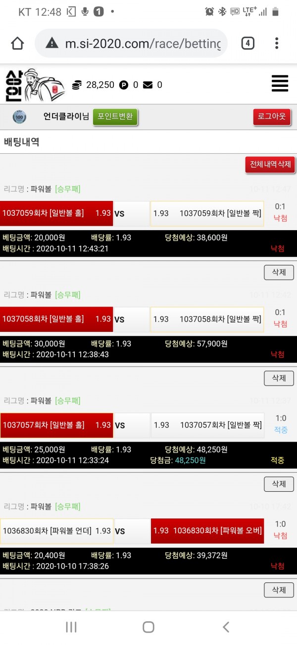일요일 배팅내역입니다