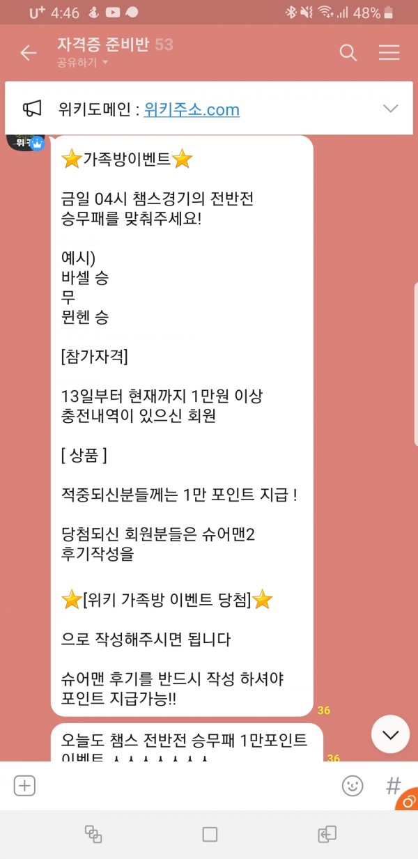 새벽에 재미난 경기가 있어서 베팅하고 보구 잘지 그냥 잘지 생각하고 잇었는데 위키에서 가족방 이벤트를 진행해서 덕분에 잠 안자고 재밋게 보고 잇네요 ㅎㅎ