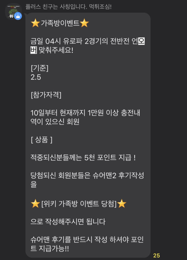 오늘 새벽 유로파 가족방 이벤트입니다~ 내용 보시면 아시겠지만 재밌지않나요 ? ㅎㅎ 이런 이벤트를 엄청 자주하니 저희 입장에서는 그저 좋네요~ 소소한 행복이라고나 할까요? 가족방을 뒤늦게 참여했는데 좀 일찍 참여할까 하고 후회도 했네요 ㅋ 다들 시간 나시면 가족방 한번씩 놀라와보세요 신세계를 경험하실겁니다!
