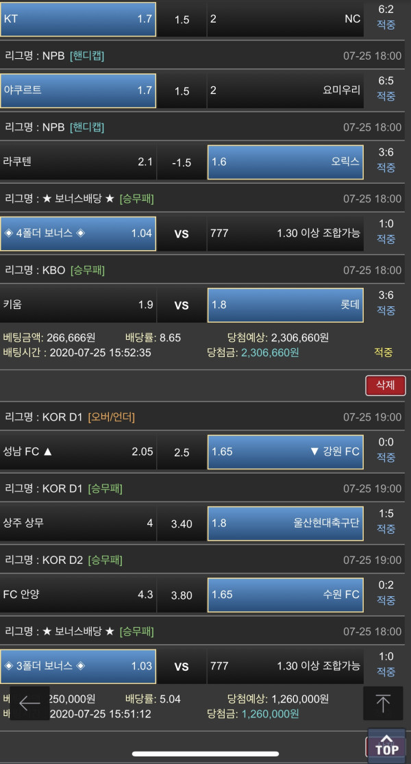 어제 배팅내역입니다! 이게 바로 찐 아니겠습니까?