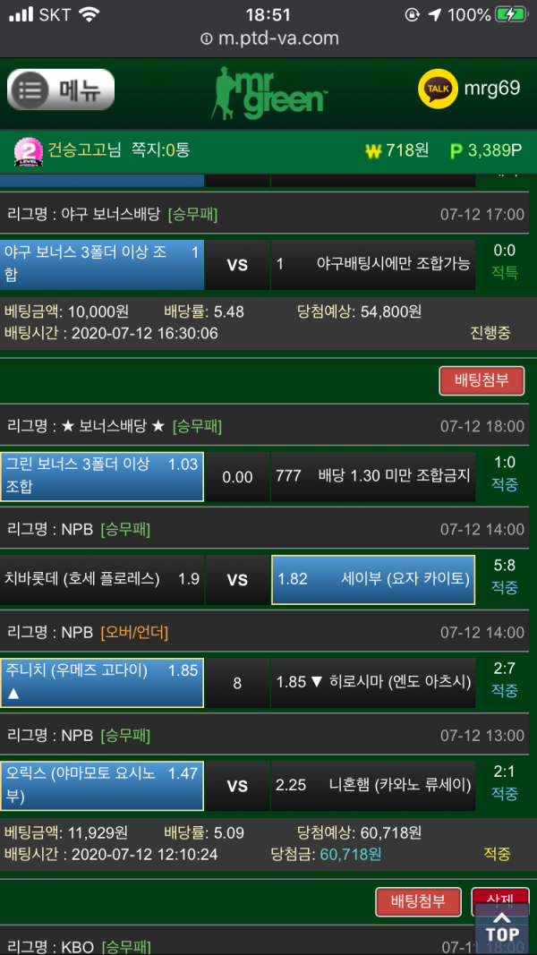 오늘 일야 점심경기걸었는데 당첨 ㅅㅅㅅ