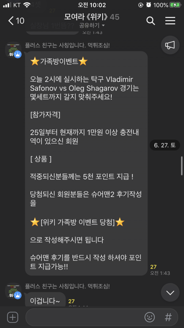 한상 이런 좋은이벤트 너무 감사합니다 꾸준히 이용하겠습니다 가족방 분위기도 너무 좋고 항상 새벽에 이런 이벤트해주시니 당첨될때 마다 기분도 너무 좋네요 항상 응원합니다 좋은 곳입니다 항상 감사드립니다