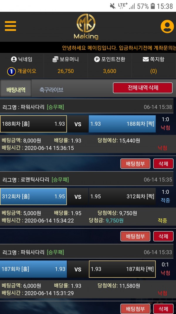 다음 배팅부터는 낙첨보다 적중이 더많길바랍니다.