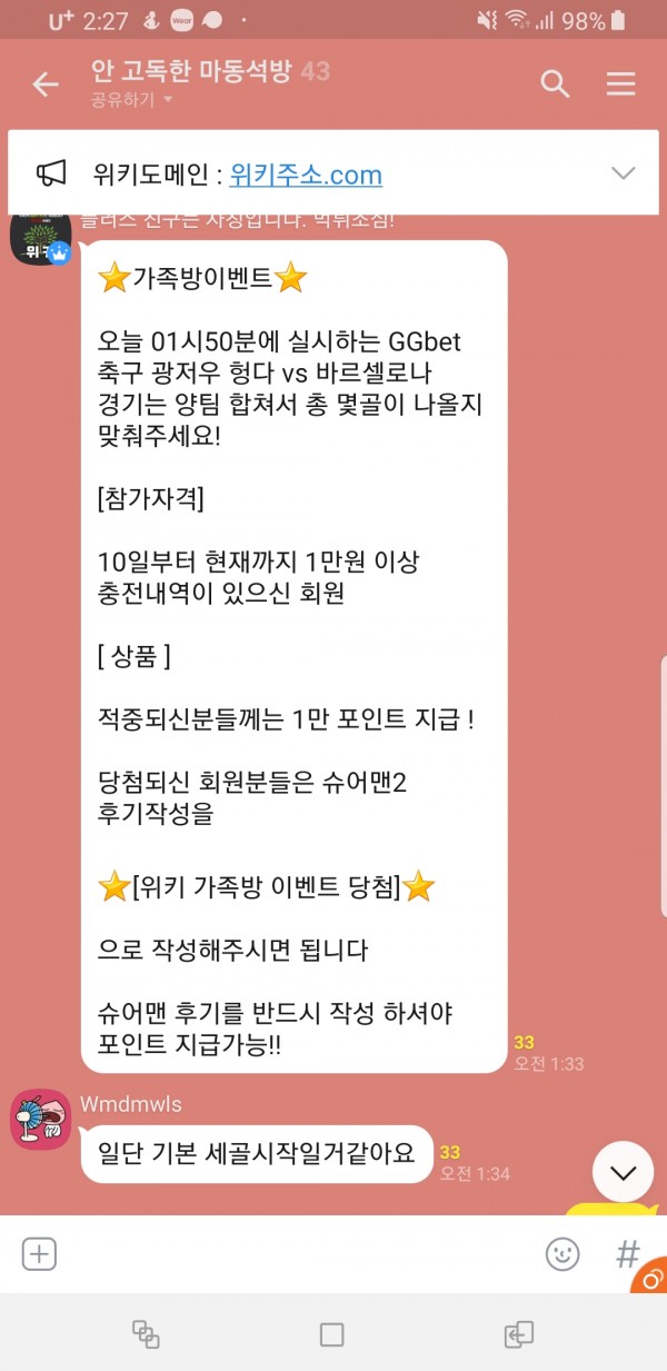 요새 위키 새벽에 이벤트 많이 하고 다들 당첨 한번씩 되시라고 애쓰시는거 같아여 ㅋㅋ 거의 참여하시믄 받아가시는듯 다들 위키 가족방 ㄱㄱㄱㄱㄱ