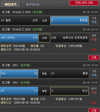 배팅하신 KBO경기와 가상경기들 낙첨 진심으로 안타깝습니다T-T..