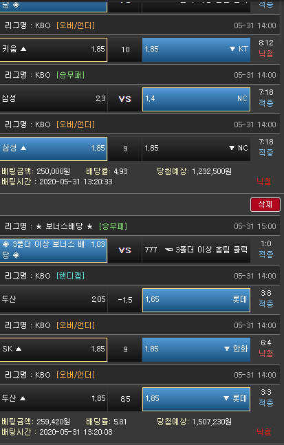배팅하신 KBO 경기들 한폴낙 진심으로 안타깝습니다T-T..