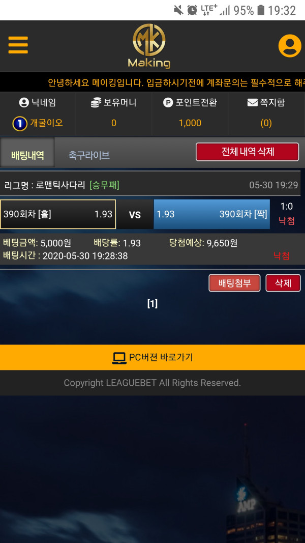 5000원 배팅은 낙첨이네요