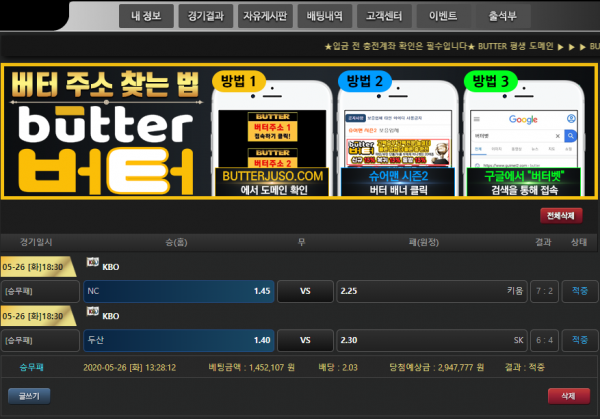 항상 버터를 이용하고 있습니다^^ 이때까지 배팅하면서 한번도 제제 받아본적도 없고