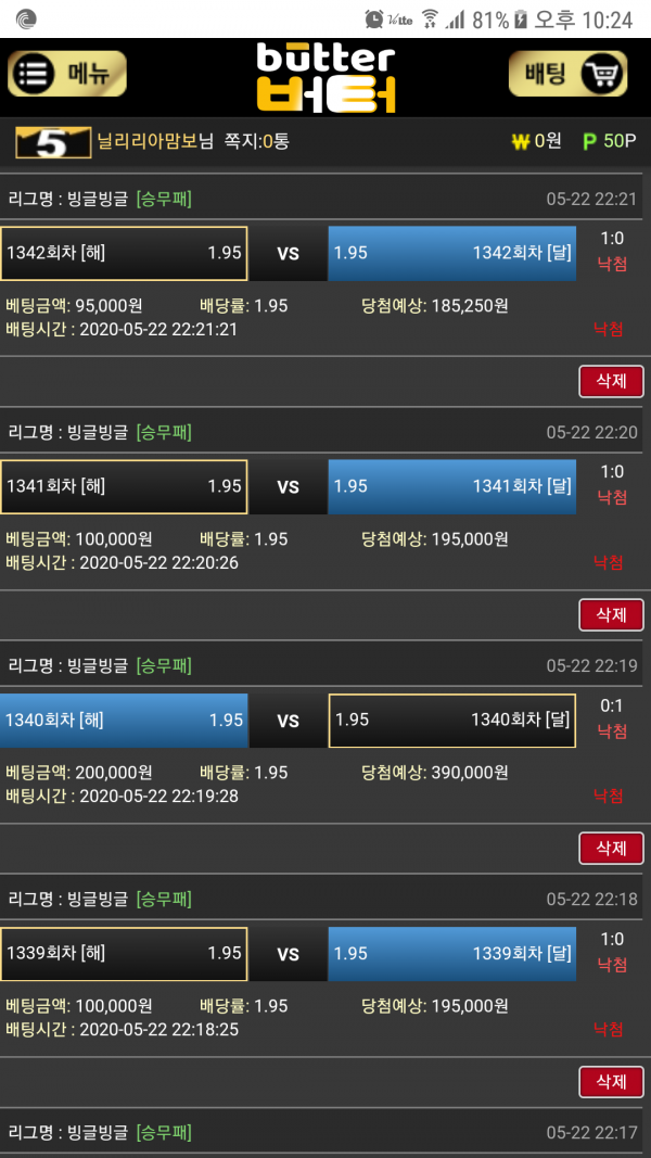 ㅂㅓ터 실시간 후기.. 페이지 정보 작성자 닐리리아맘보 작성일20-05-22 22:25 조회139회 댓글0건 관련링크 목록 본문 잘나가다가 금액올리니 귀신같이 연패...욕심이 화를 불렀네요ㅜㅜ 댓글목록 등록된 댓글이 없습니다. 목록