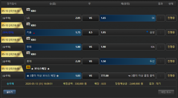 오늘 KBO 쓰나미네요 ..... 다음 배팅은 꼭 성공 하셨으면 좋겠습니다.