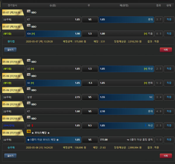 어제도 상한드시고, 오늘도 이어서 적중하셨네요! KBO 달인이시네요!