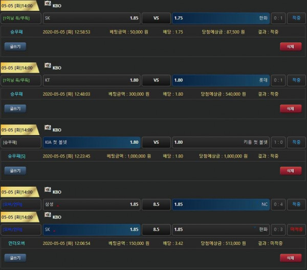 배팅하신 KBO 경기 단폴배팅 적중 진심으로 축하드립니다. 한폴낙은 진심으로 너무 안타깝습니다 T-T