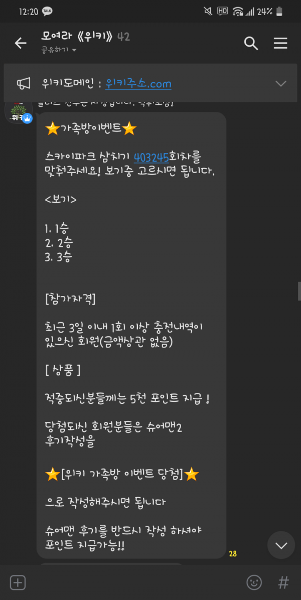 매번 소소한 이벤트 마련해주셔서 감사합니다~ 삼치기가 뭔줄 몰라서 어떤게임인가 보고있었는데 그시간대에 2개가 없고 거의 1이고 3은 몇번 나왔어서 2를 골라봤는데 운이 좋았나봐요 연휴기간에 업무보시느라 고생하시고 가족방 신경 많이써주셔서 감사합니다
