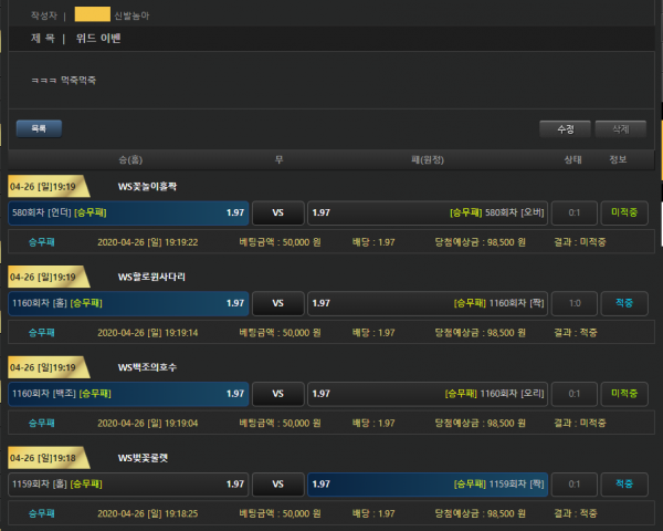 버터 이벤트 늘어났길래 바로 진행했습니다 먹죽먹죽이라 아쉽네요 그래도 배당 1.97배 타임에 해서 다행