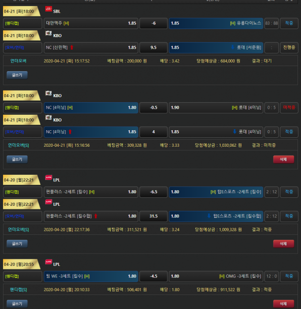 배팅내역이 거의 적중이시네요. 승률 대단하십니다.