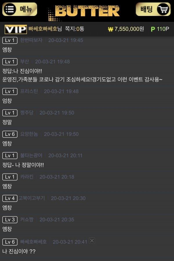 지금도 2년넘게 버터 이용하지만 좋은 이벤트 더 생각해서 하면 매일 찾을 수 밖에 없을것같은 느낌적인 느낌~ 다른 사람들도 자기들만의 각자 이용하는데도 있지만 버터 한번씩 와서 가입해보고 이용해보셨으면 해요이벤트만 참여해도 못해도 1~3만원 포인트 지급이라고 써져있는데, 요즘 시급 만원이라고 ㅇㅈㄹ하시는데 직장없는 사람 태반입이라고 생각합니다. 버터에오셔서 10분도 안걸리는 이벤트도 하고 경기도 있으면 같이 건승들 합시다 여러분~~~