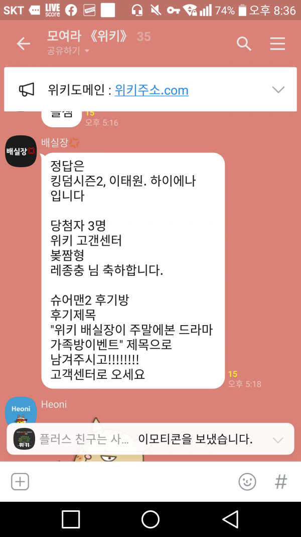 가족방내에서 이벤트 당첨 축하드려요 !