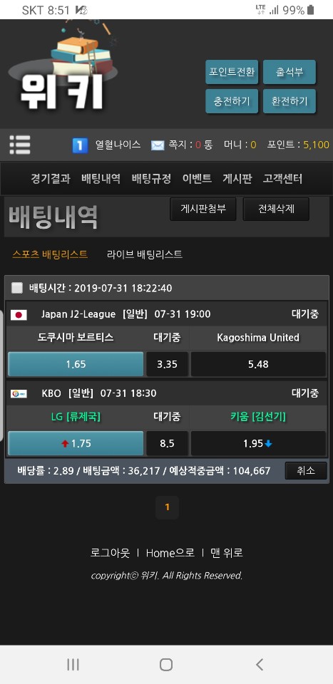 이제 위키로 옮긴지 오늘 첨으로 배팅해봤어요.