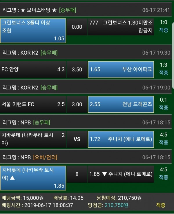 어제도 적중 오늘도 적중!!!!! 소소하게 기분이 좋네요!!! 미스터그린 에서는 가족방 이벤트 뿐만 아니라 월요일 / 출석 / 기프티콘 이벤트 등등 다양한 이벤트를 하고 있습니다!! 여러분들도 안전한 미스터그린에 오셔서 같이 즐겨보아요~
