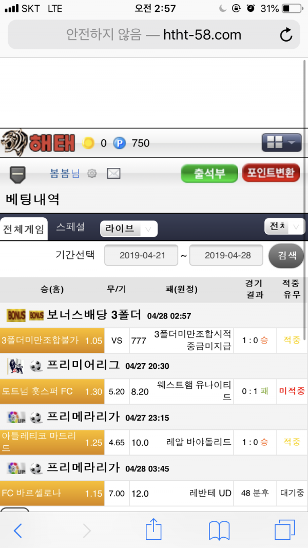 한폴낙 너무 아쉽지만 다음 배팅은 적중을 기원합니다~