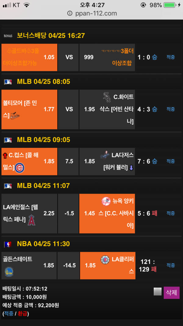 오늘도 양키 한폴낙인가 했는데 역전해서 적중되었네요