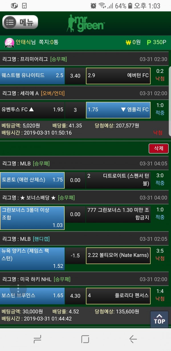 아쉽게도 낙첨이라니... 오늘 경기가 많으니 오늘은 꼭!! 적중하시고