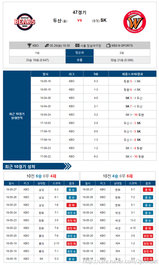 이영하의 앞선 SK전은 분명 성공적이었다. 그러나 이번 등판은 중간에 한번 30구를 던지고 등판했다는 변수가 있다. 물론 박종훈도 큰 기대를 걸기엔 무리가 있지만 이저느이 이영하는 지금과 다르고 SK의 타격 역시 어디 밀리는 타선은 아니다. 선발에서 앞선 SK가 승리에 가까이 있다.